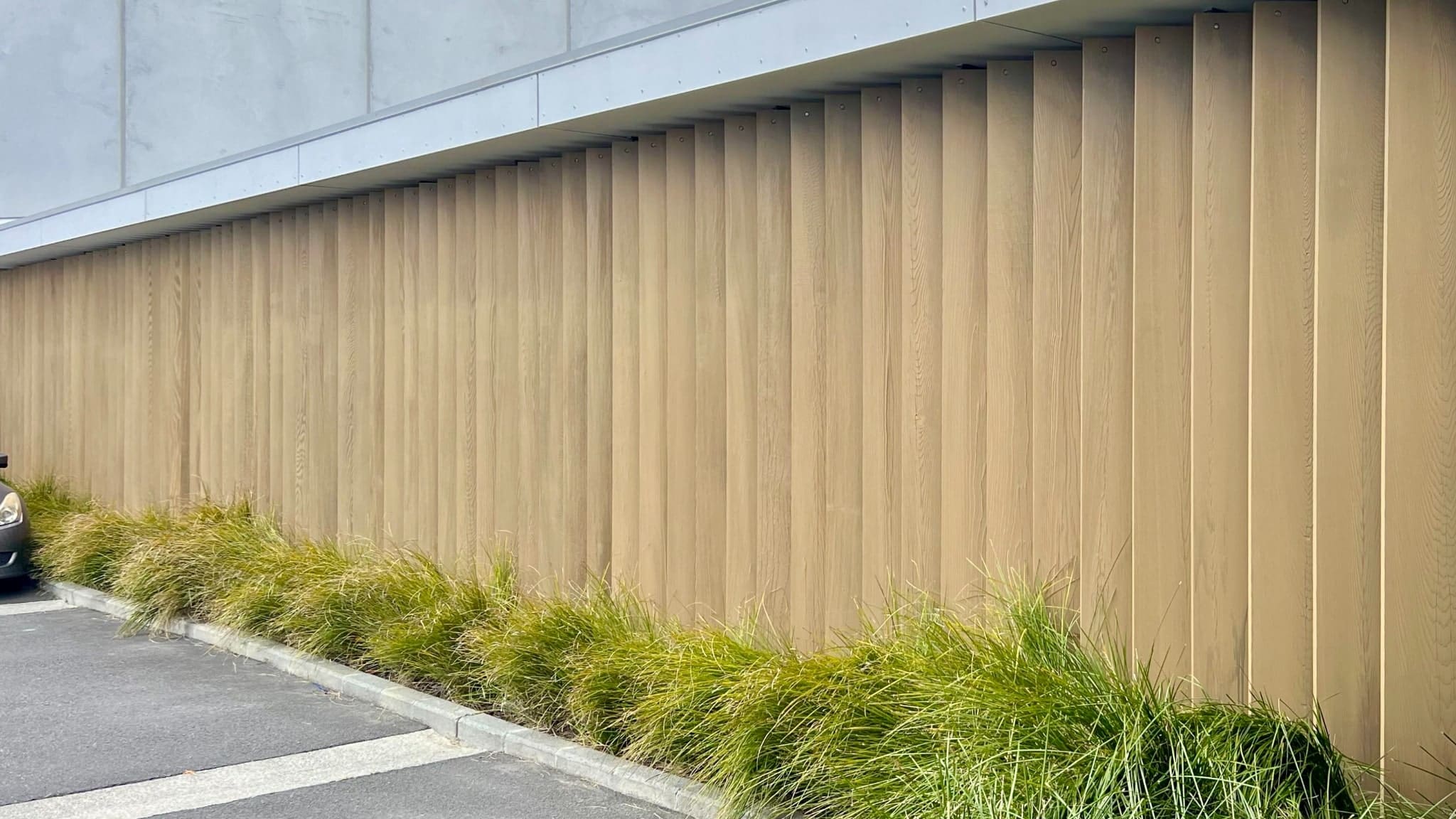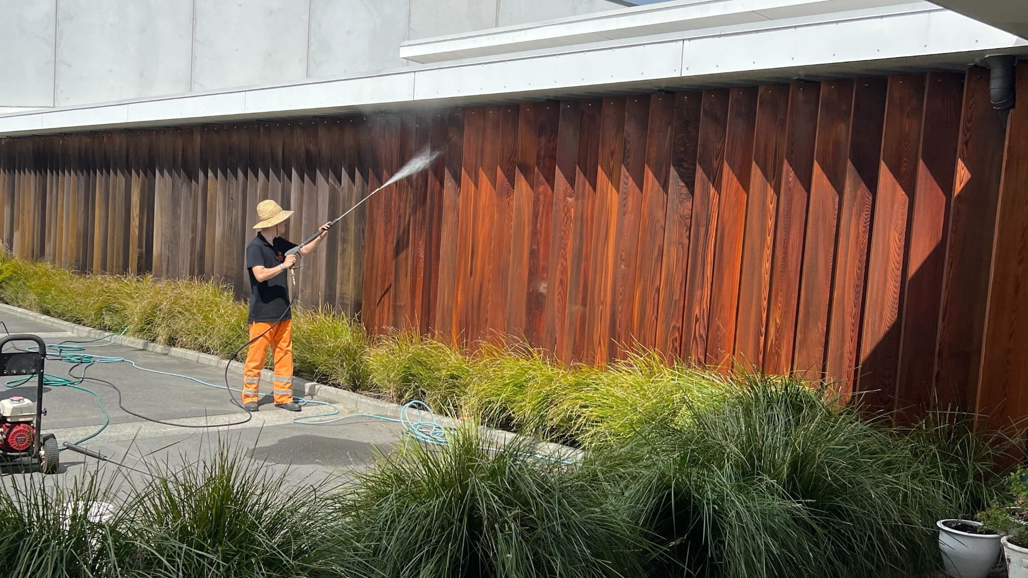 The transformation was immediate. The cedar fins regained a clean, consistent colour that lifted the entire entranceway, giving the centre a warm and welcoming first impression once again.