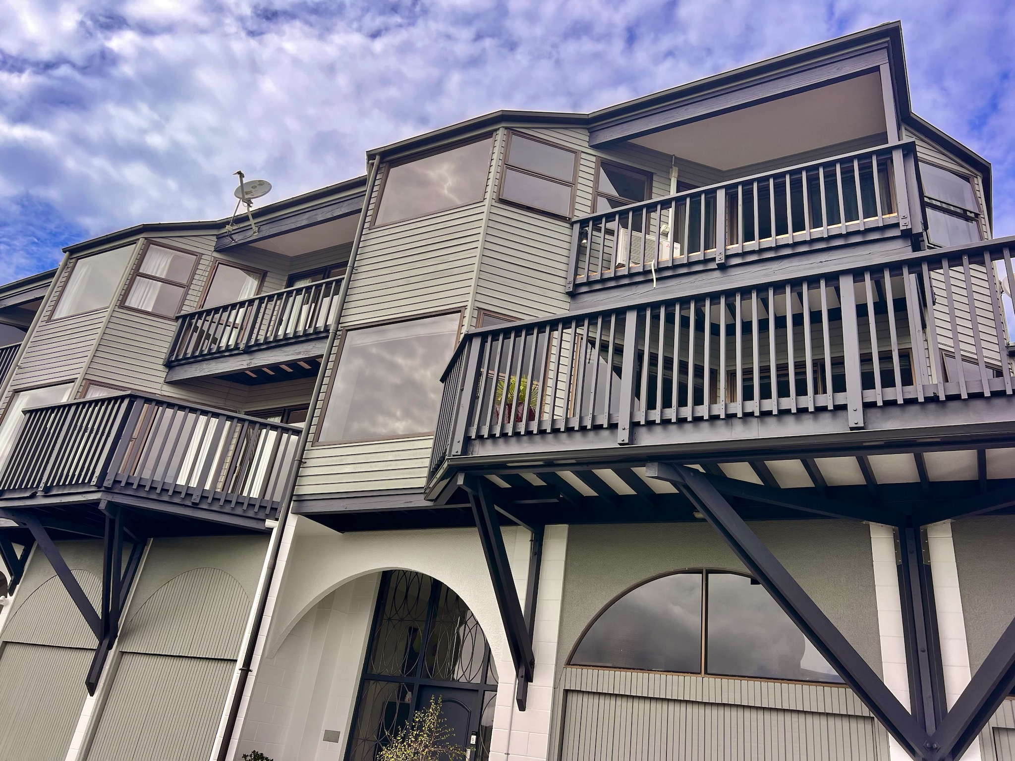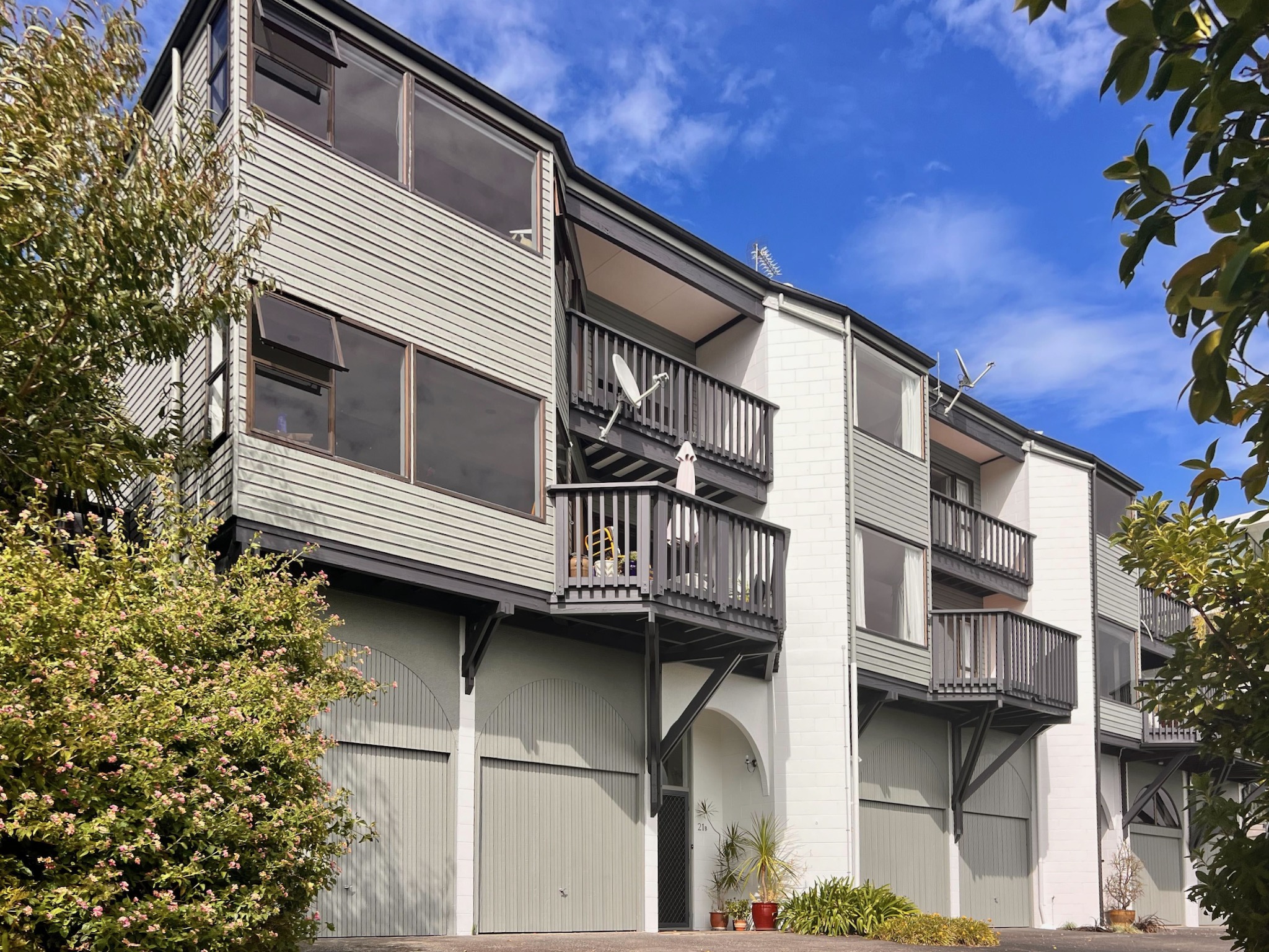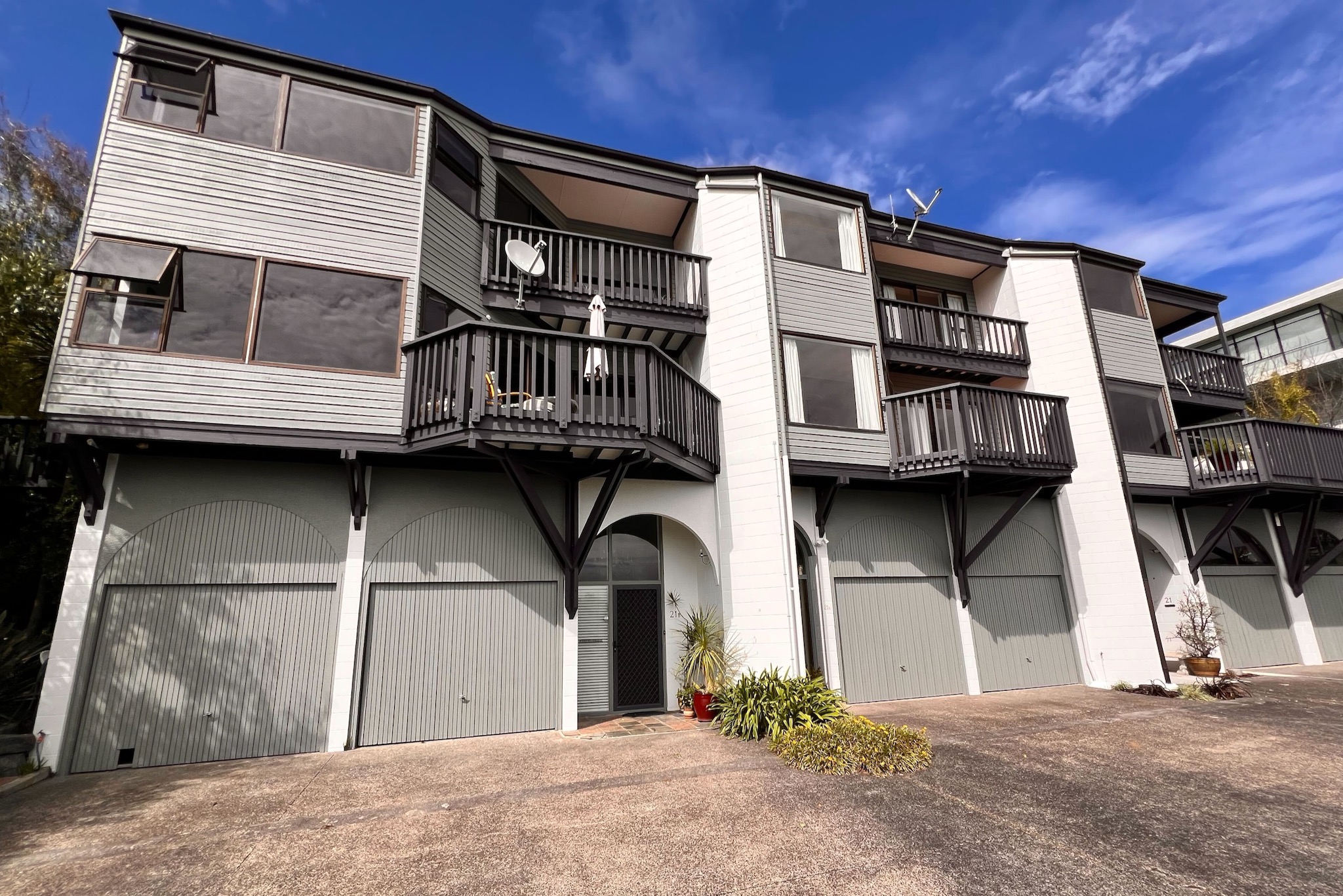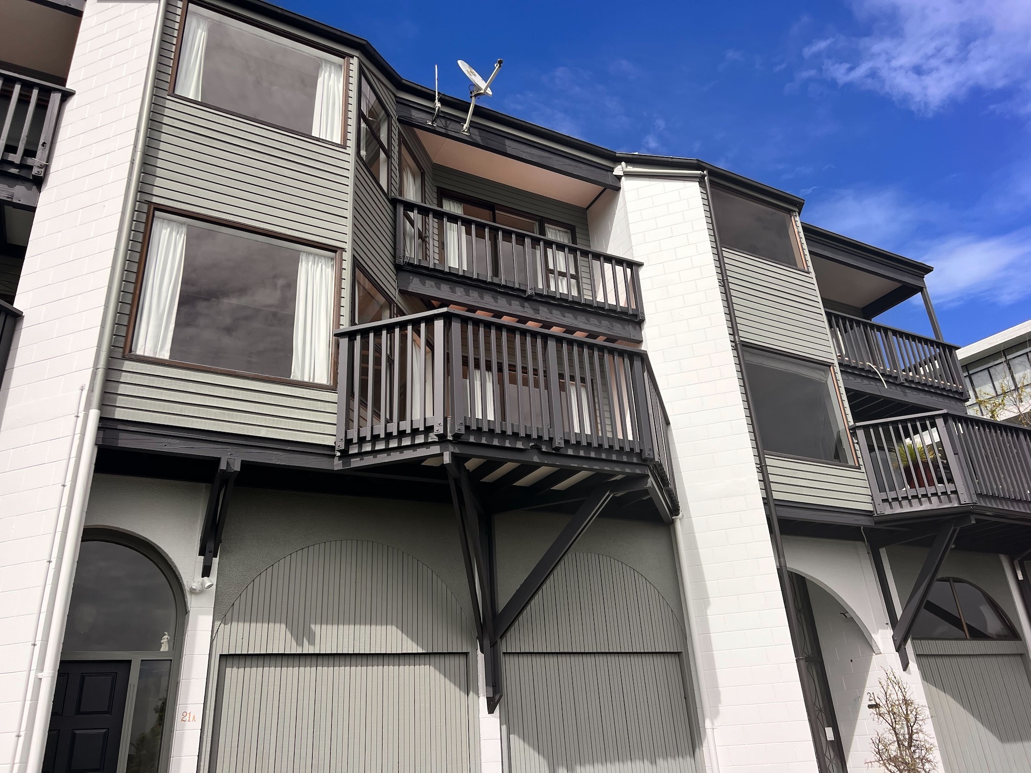 Cedar weathers hard when it’s left too long, and these three Orakei townhouses on Watene Crescent were showing it. The weatherboards were oxidised and chalking, and with three storeys to cover across all three units, this was a sizeable exterior repaint from the outset. Auckland City Painters managed the full scope — scaffolding, preparation, and painting — while working alongside a builder who was on site completing repairs throughout the job.