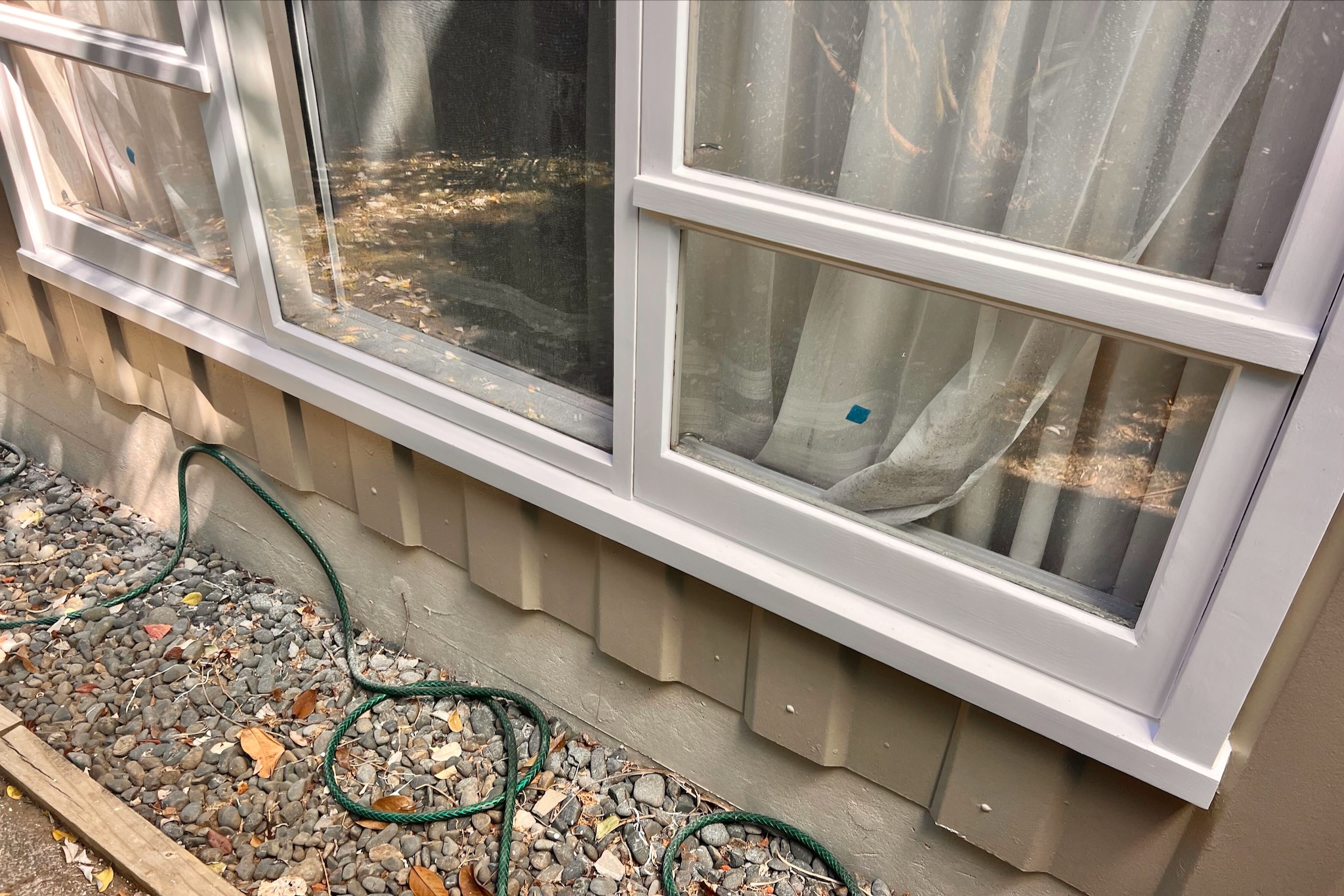 Sanded and prepared the weathered window joinery before repainting in Resene Enamacryl White for a clean, refreshed appearance.